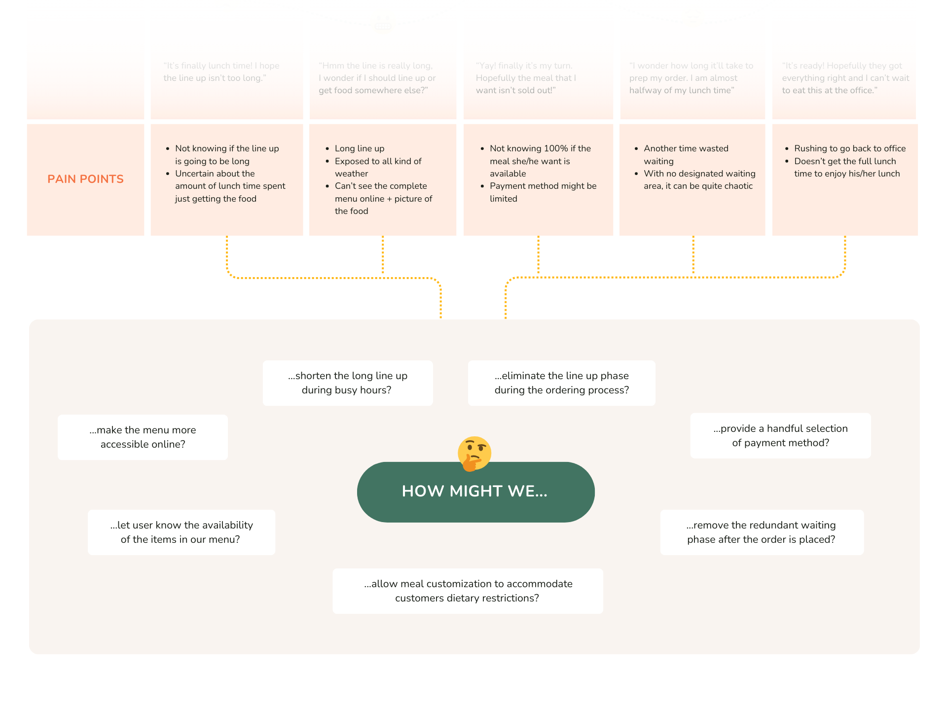From this journey, I developed several How Might We statements, each addressing a specific challenge within different parts of the user journey. These statements guided my problem-solving approach, helping me explore potential solutions for improving the ordering process.
