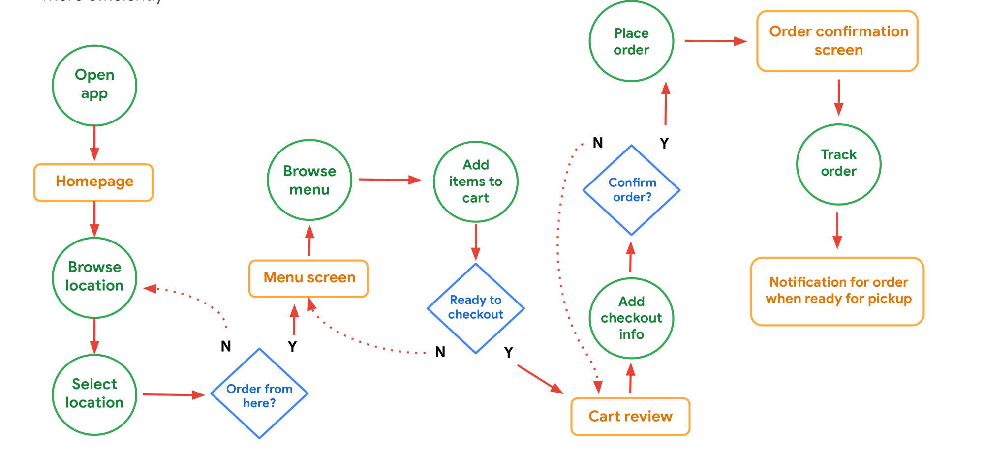 I mapped out a user flow that outlines the key steps a customer takes to order and pick up their meal. This helps identify potential friction points and optimize the process for efficiency.