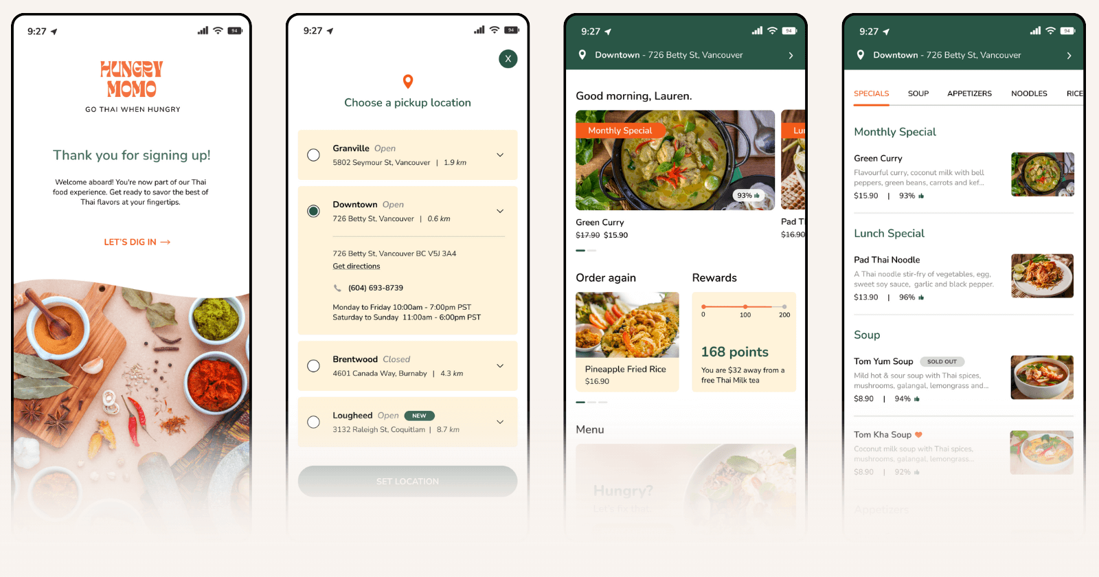 Once the wireframes were tested, refined, and validated, I moved on to building the high-fidelity prototype using Hungry Momo’s visual identity — colors, typography, and imagery inspired by its vibrant Thai street-food style.