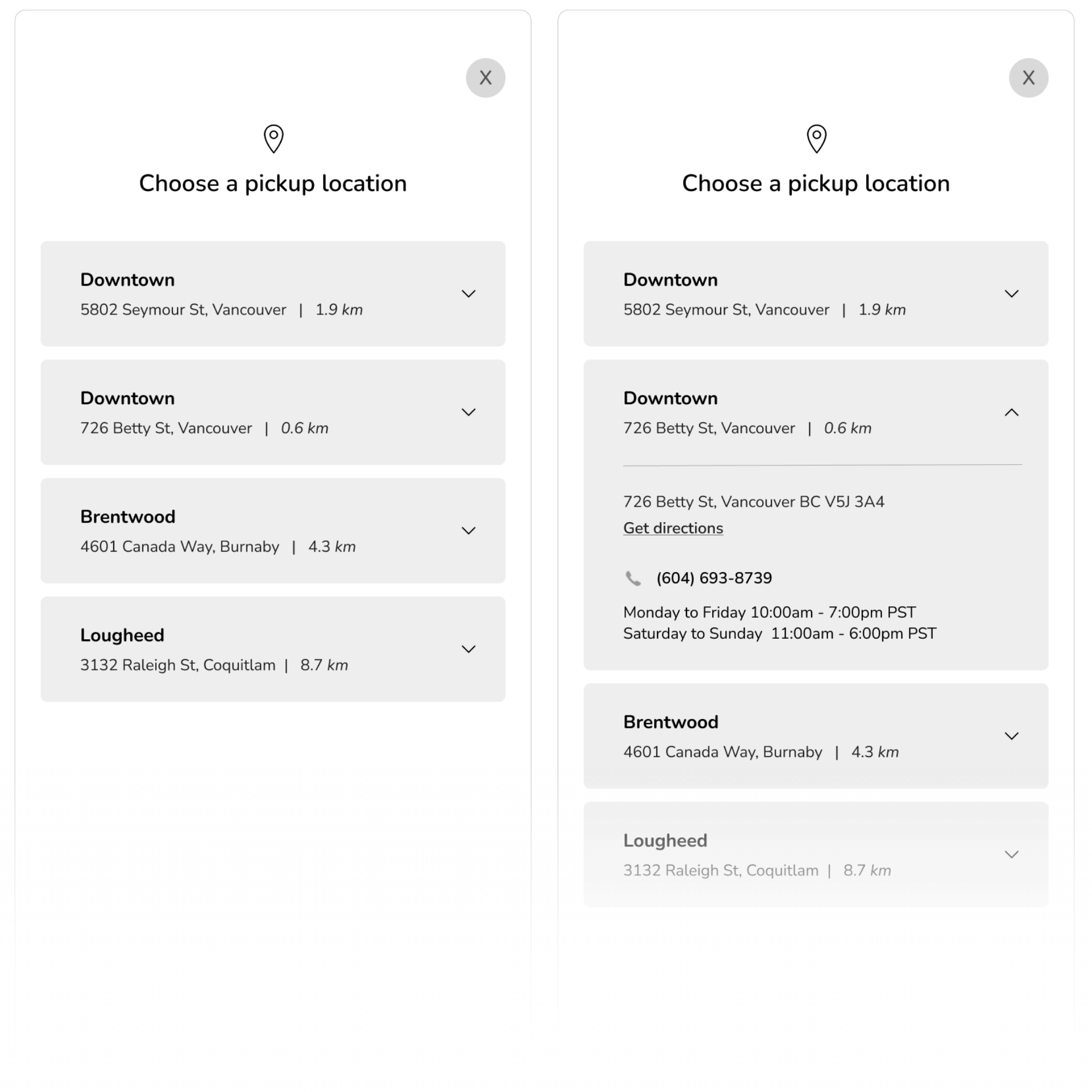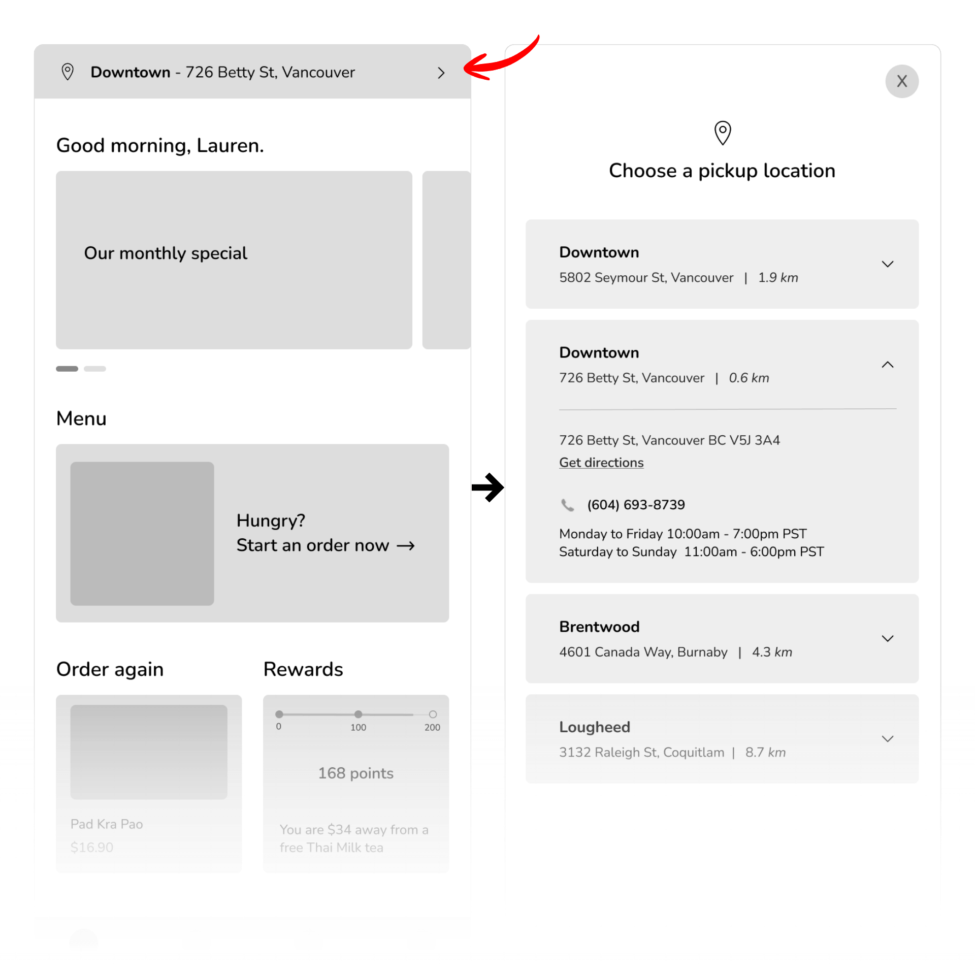 I kept the pickup location dropdown at the top of the screen but redesigned it to make it more noticeable. I removed the main logo to free up space, expanded the dropdown to full width, and added a default location format showing both the name and address (e.g., “Brentwood – 4601 Canada Way, Burnaby”) so users can see the full details without tapping.