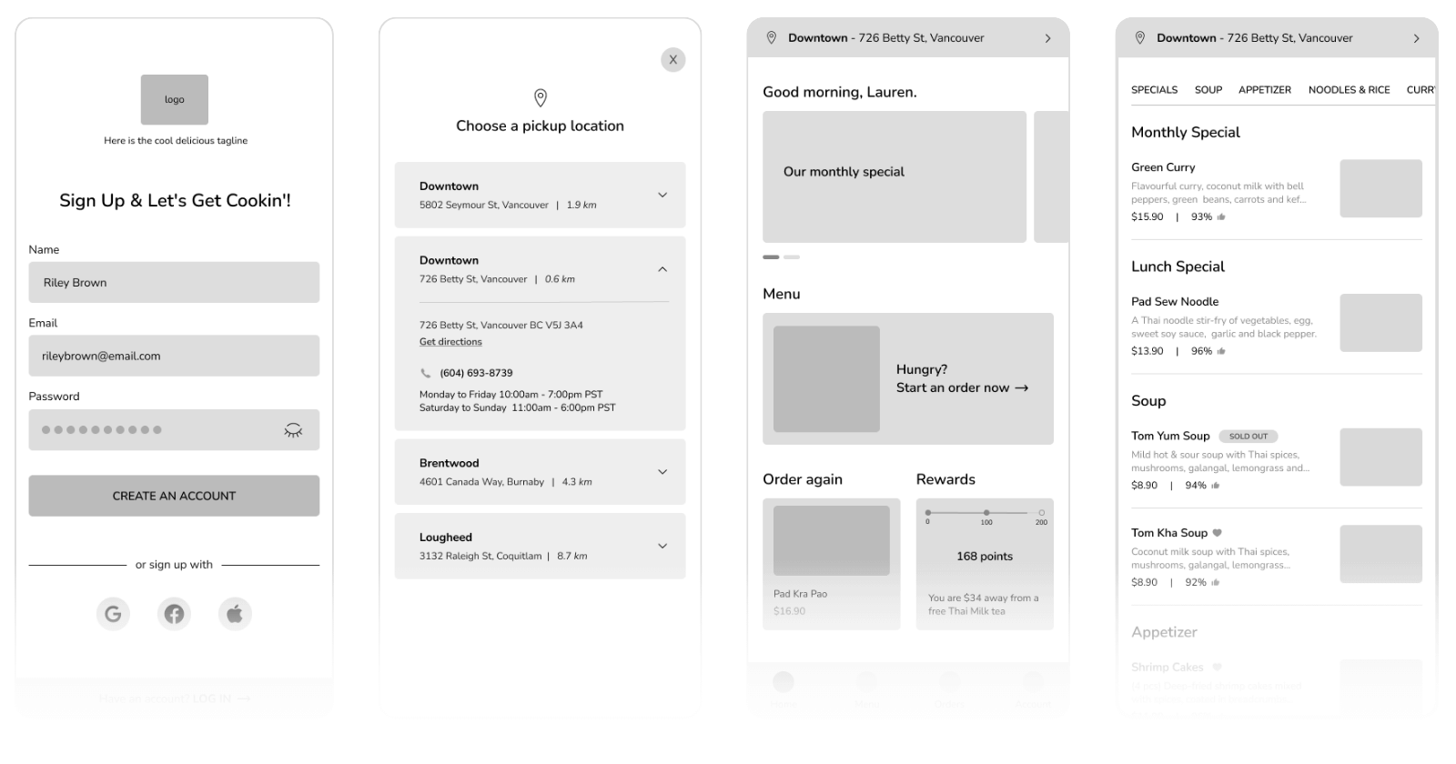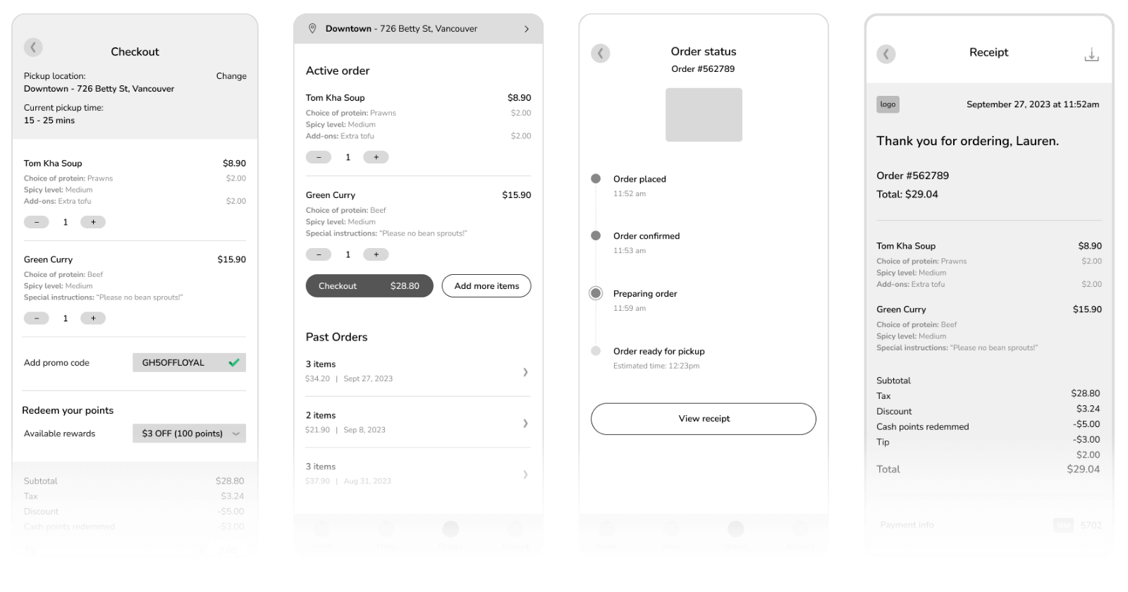 I updated each screen for clarity and usability, integrating the feedback from user testing and implementing solutions to address the key pain points. Finally, I added interactive elements and transitions to bring the experience to life and simulate the full end-to-end ordering flow.