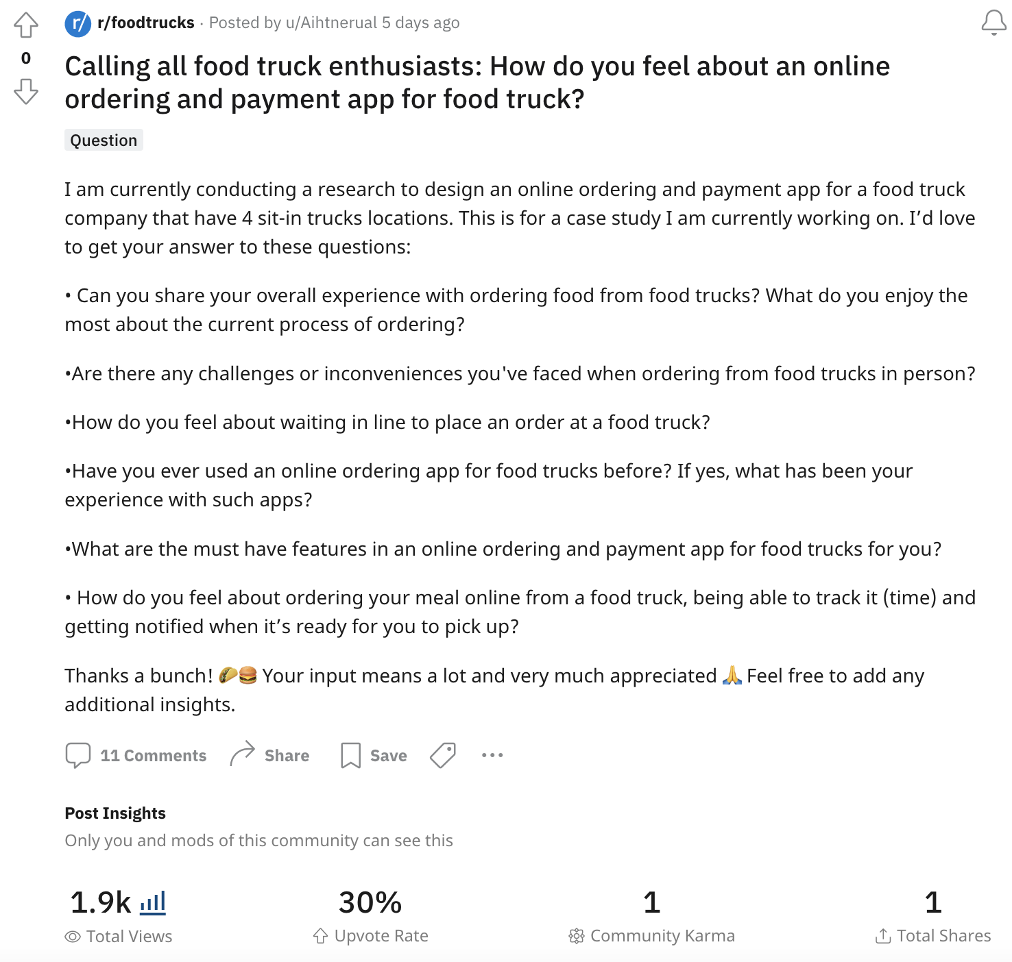 I conducted interviews with five participants who represent the ideal users of the app. These included working professionals and students over 18, each with significant experience ordering from food trucks (at least 10 times). Additionally, I posted on the Food Truck subreddit to gather insights from the broader community about their experiences and opinions on the concept of an ordering and payment app.