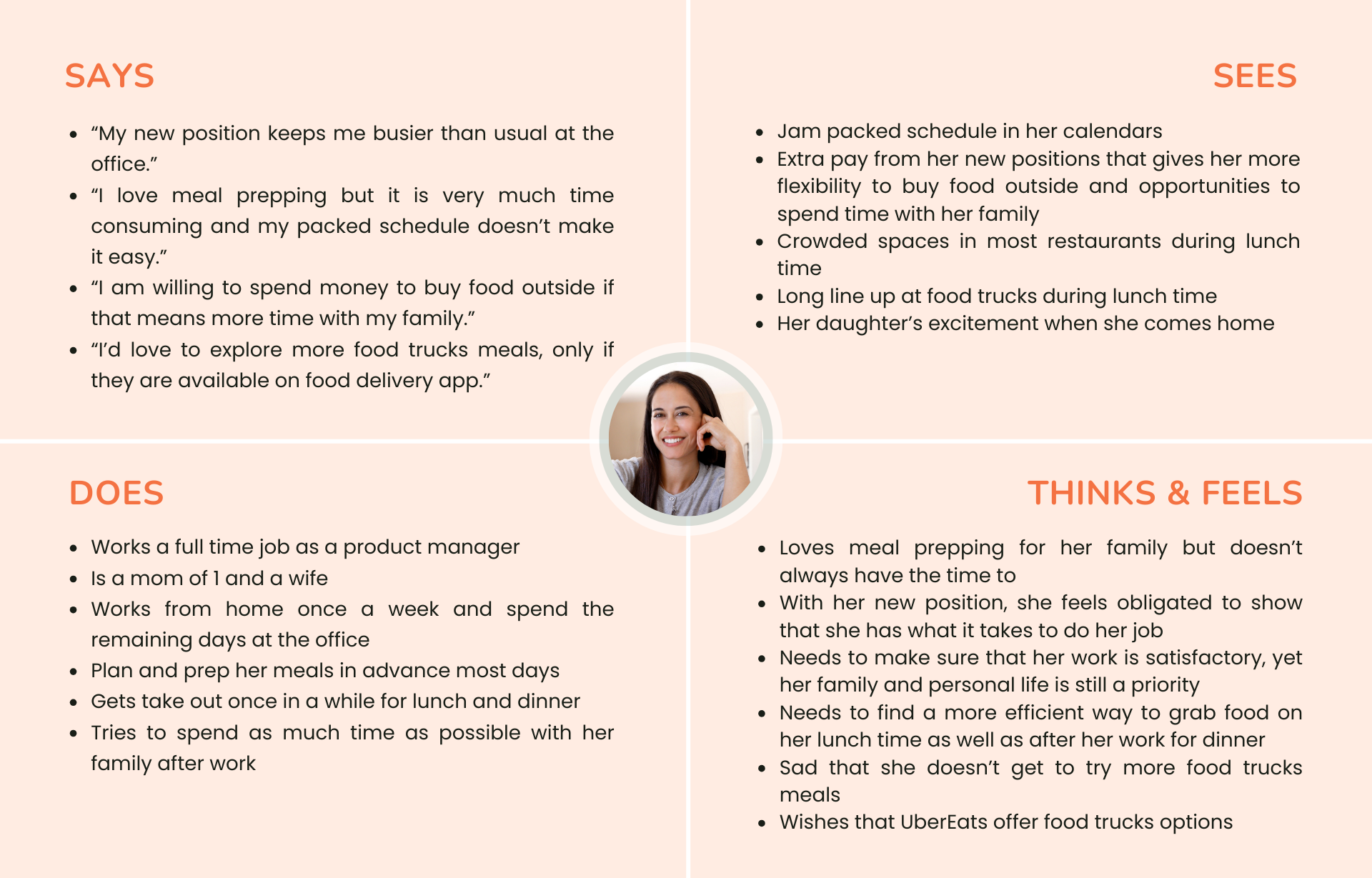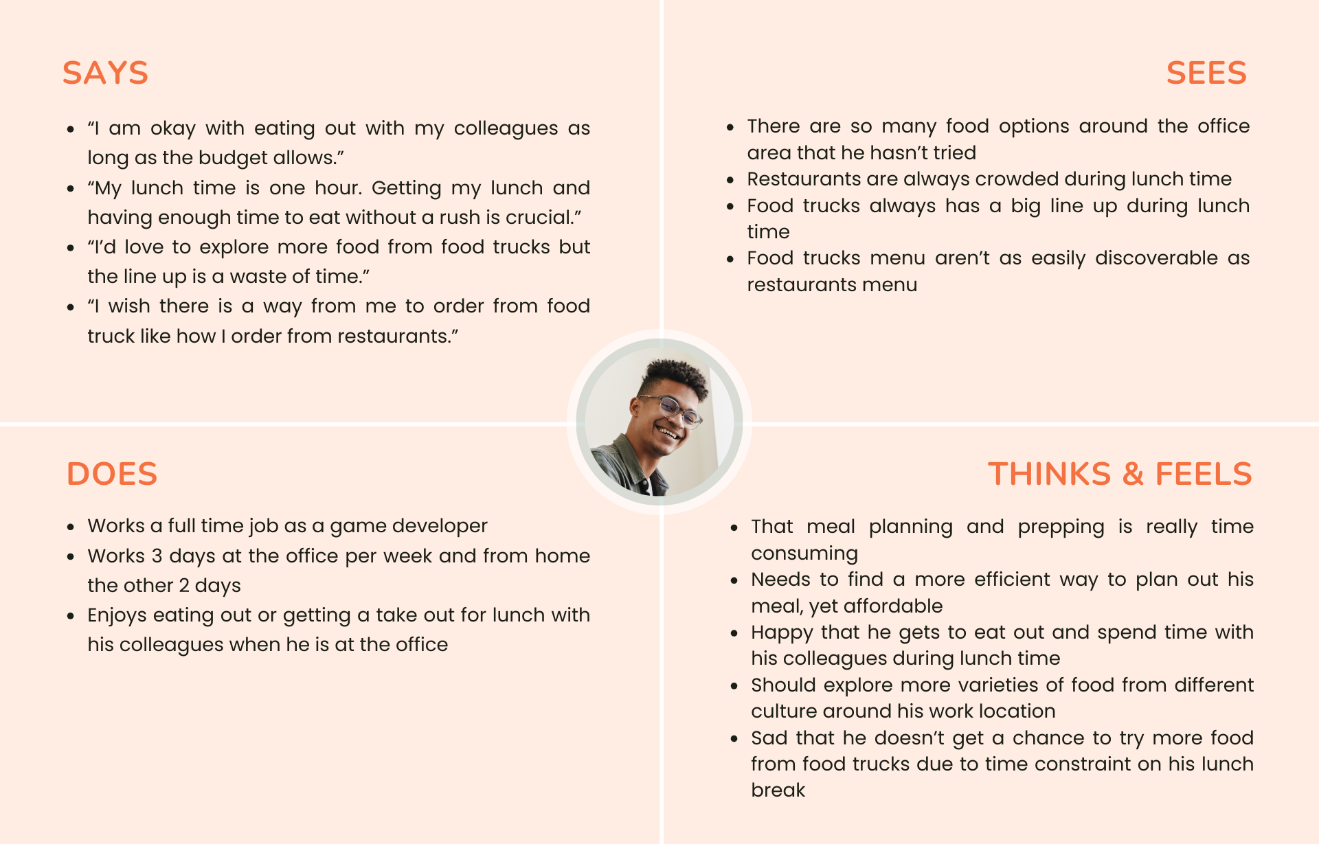 With both of my personas in mind, I created a journey map to visualize the experience of the customer when buying a meal from a food truck. This allows me to comprehend customers’ thoughts, emotions, pain points and their choice of actions at each moment in this buying journey, and then figure out how to best improve their experience.